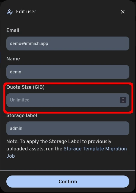 In order to select a storage quota, click on the pencil icon and enter the storage quota in GiB. You can choose an unlimited quota by leaving it empty (default).